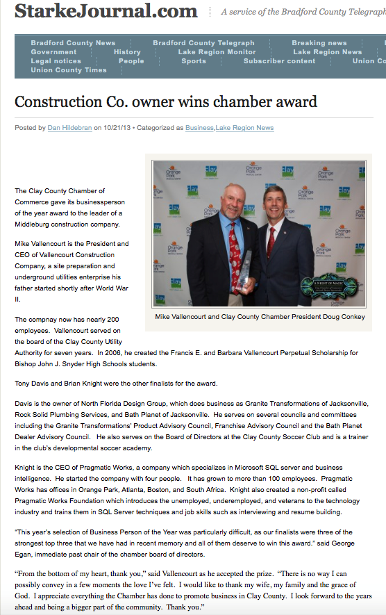 The Clay County Chamber of Commerce named Mike Vallencourt the Business Person of the Year for 2013.